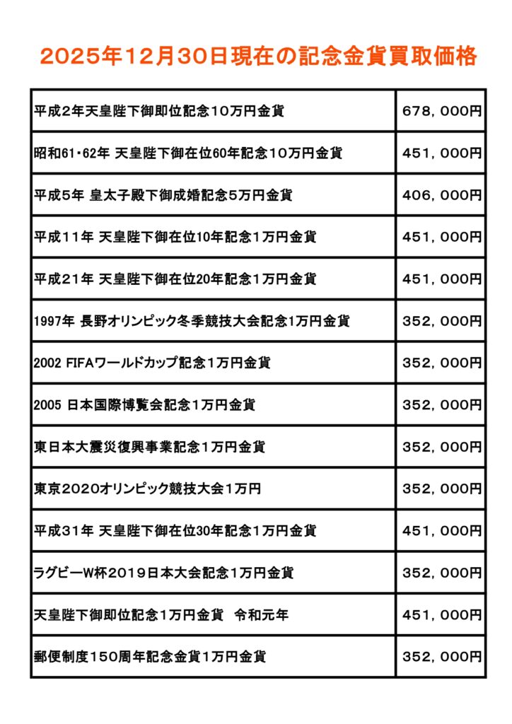 記念金貨買取価格一覧(2026年1月5日現在) 新着情報 2026/1/5 月曜日 買取価格は日々変わります。買取時に再度ご確認ください!裸の状態のものでも同額で買取いたします。 #記念金貨 #天皇陛下御即位記念 #天皇陛下御在位記念 #皇太子御成婚記念 #1997年長野五輪記念 #東日本大震災復興事業記念#坂戸市 #鶴ヶ島市 #川越市 #東松山市 #日高市 #狭山市 #入間市 #飯能市 #熊谷市 #富士見市 #ふじみ野市 #さいたま市 #毛呂山町 #越生町 #鳩山町 #ときがわ町 #吉見町 #川島町 #滑川町 #嵐山町 #小川町 #東秩父村 #埼玉