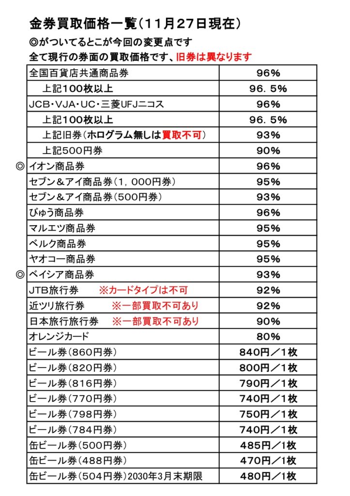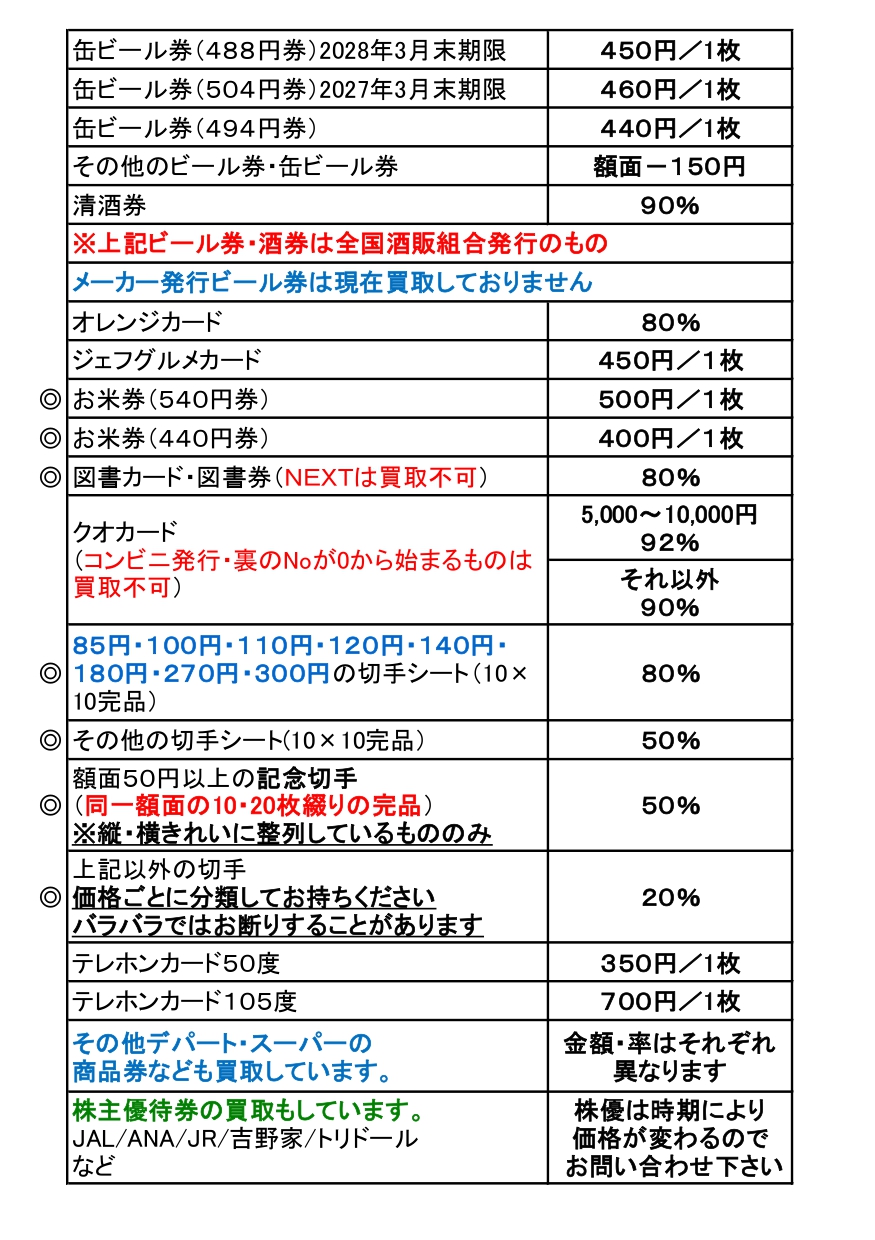 その他主な取扱い商品券:各デパート商品券(三越伊勢丹・東武・西武・高島屋など)・各スーパー商品券(ヤオコー・CDCグループなど)・株主優待(ANA・JR・ビックカメラ・アルペン・吉野家・トリドールなど)