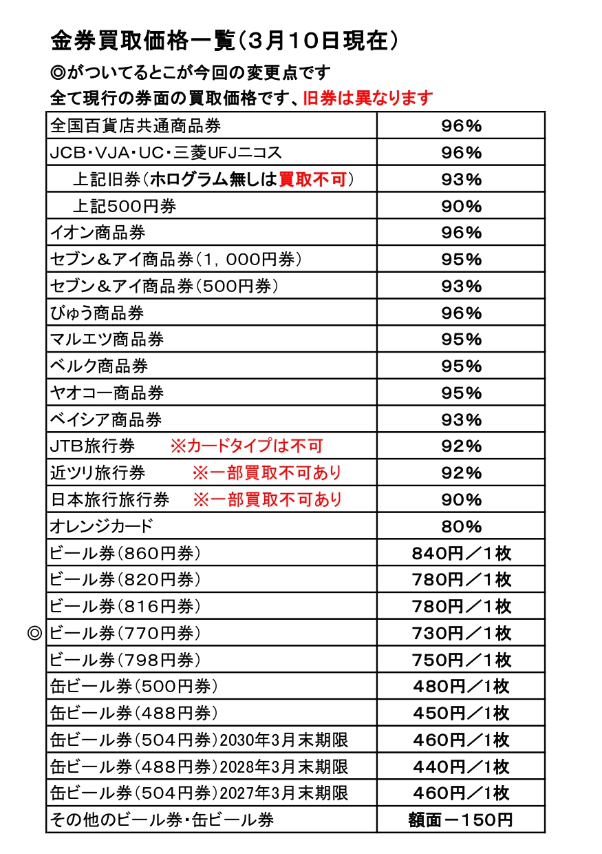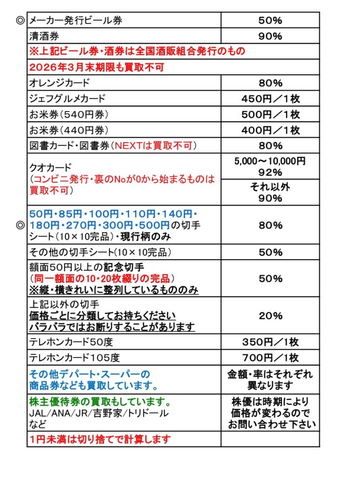 その他主な取扱い商品券:各デパート商品券(三越伊勢丹・東武・西武・高島屋など)・各スーパー商品券(ヤオコー・CDCグループなど)・株主優待(ANA・JR・ビックカメラ・アルペン・吉野家・トリドールなど)