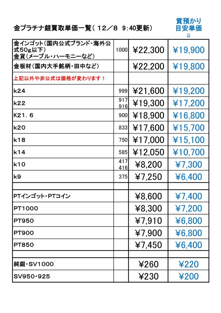 金プラチナ買取価格(2025年12月8日9時40分更新) –