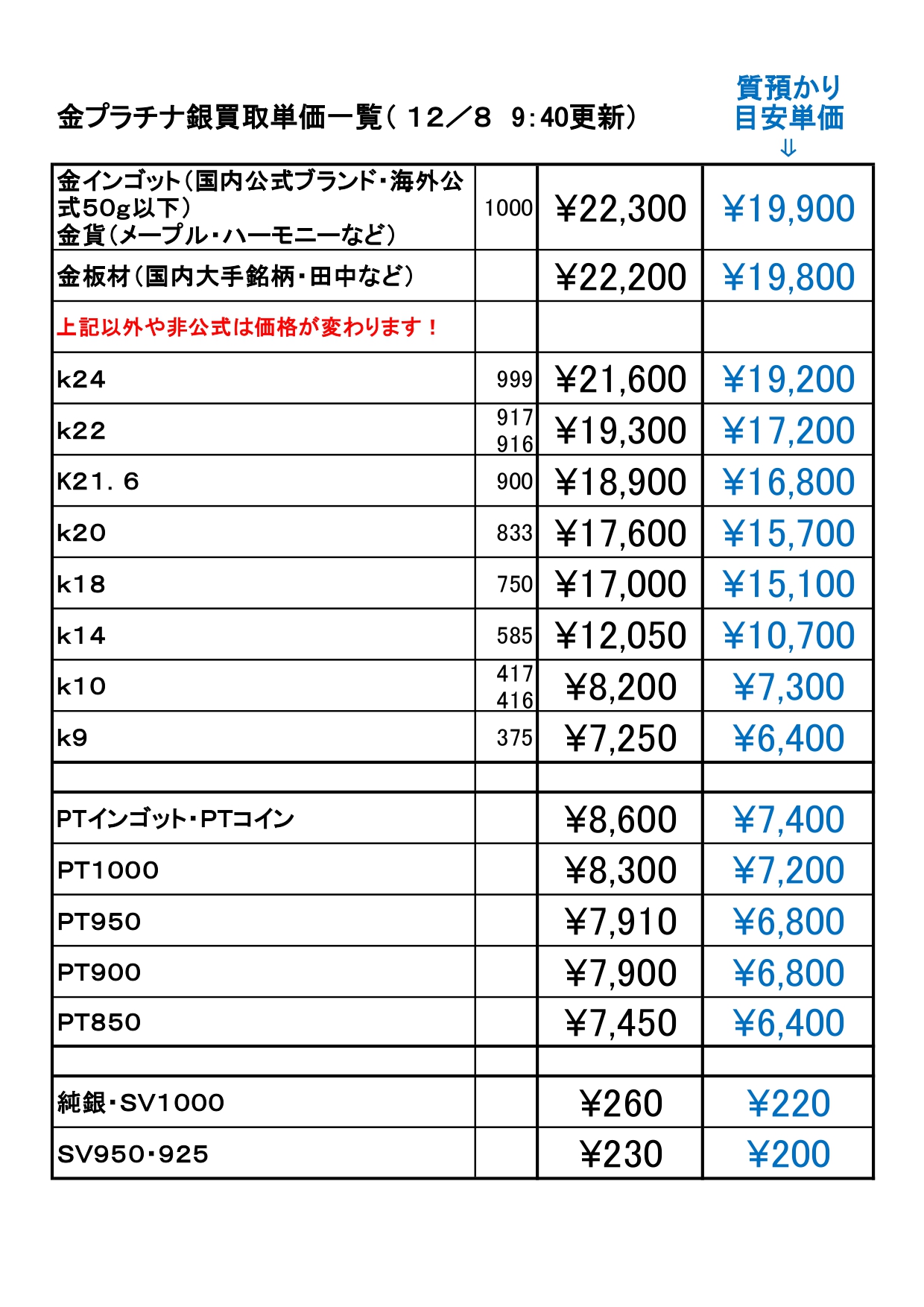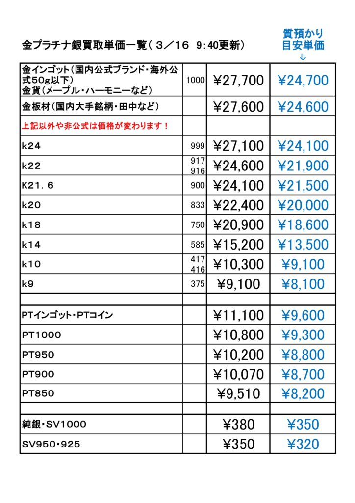 ※海外製・公式地金ブランド以外は金額が変わりますので、その場でお調べします。